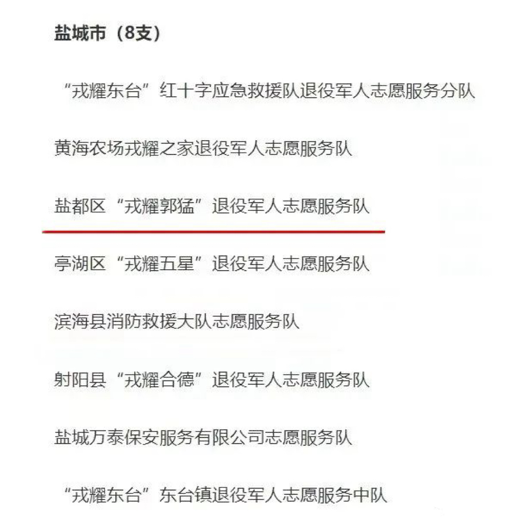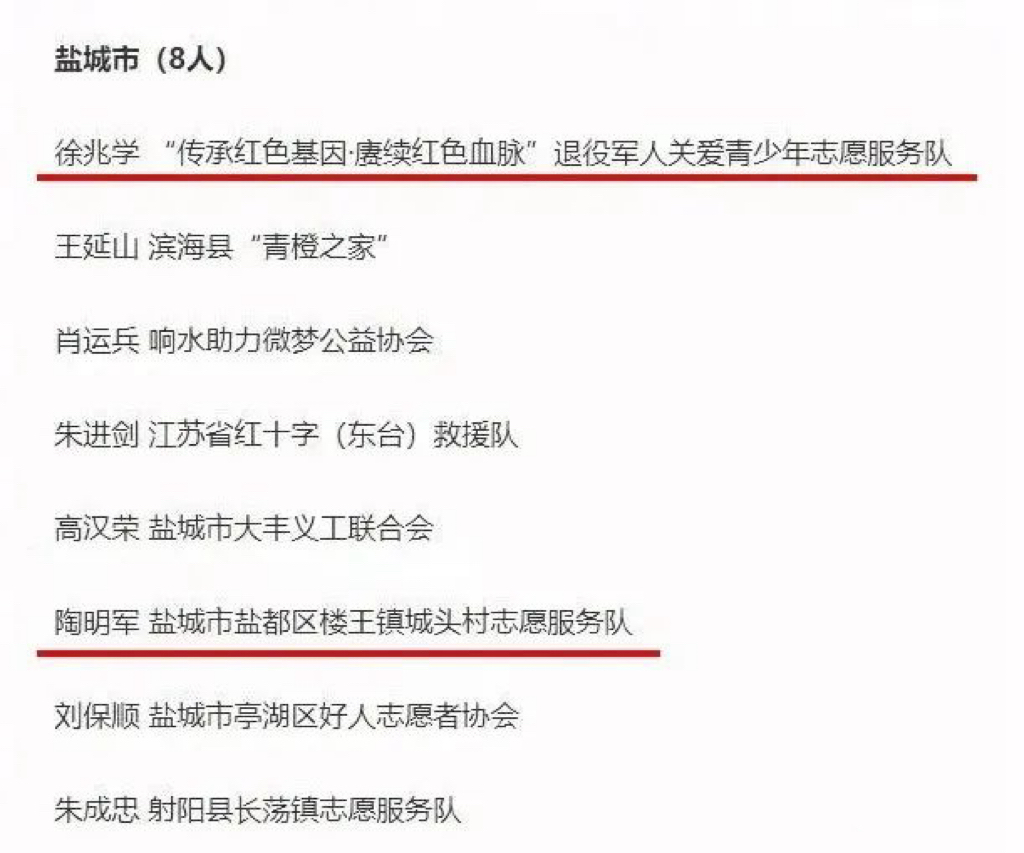 近日,2023年度江苏省退役军人、志愿服务“双百”先进典型拟表扬对象名单公示结束,其中盐都区“戎耀郭猛”退役军人志愿服务队入选“优秀退役军人志愿服务队”遴选名单,徐兆学、陶明军入选“优秀退役军人志愿者”遴选名单。