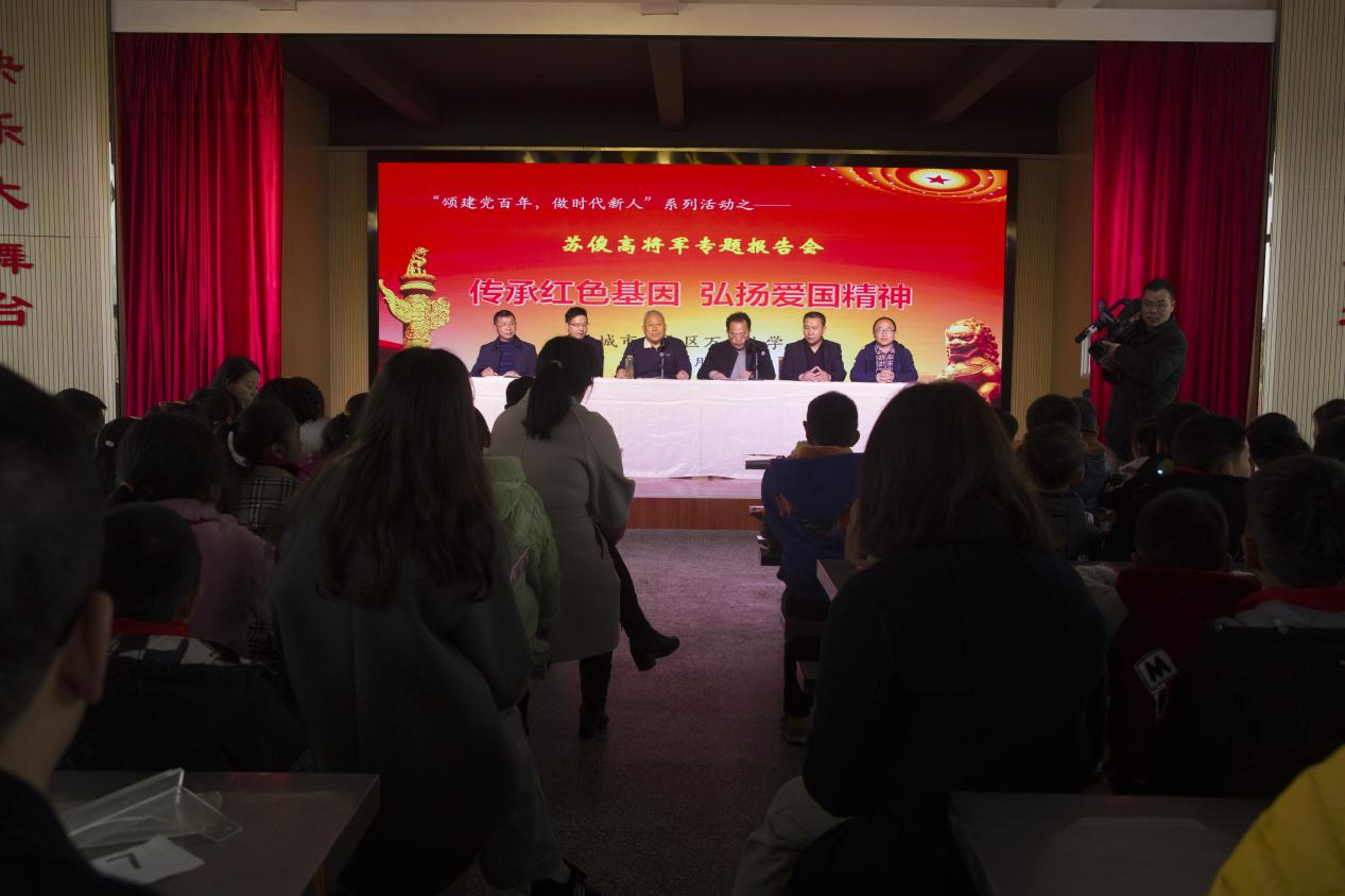接着,苏将军来到学校礼堂,为全校师生作了题为“传承红色基因,弘扬爱国精神”的专题报告。他声情并茂地讲述了自己从一个普通的农家孩子到共和国将军的成长历程,充满了正能量。重点讲述了三十多年前自己亲历的发生在老山前线的战斗故事。他用通俗理性的表述,形象贴切的实例,幽默风趣的语言,为全校师生带来了一场集红色传统教育、爱国主义教育、国防教育、励志教育于一体的红船精神、长征精神、铁军精神大餐,极大地激发了全校师生的爱党爱国爱军爱家乡情怀。苏将军语言平实朴素,娓娓道来,饱含着对万小师生的殷殷期盼之情,他的每一句教诲都像春雨般洒向全体师生的心田。与会师生听得津津有味,礼堂内不时爆发出雷鸣般的掌声。最后,苏将军深情寄语母校学子,要牢固树立爱党爱国爱军爱民意识,既要有远大志向,又要脚踏实地,立足当前,搞好学习,练就过硬的本领,为将来投身建设祖国的伟大事业积蓄力量,努力成为建设伟大祖国的栋梁之才!