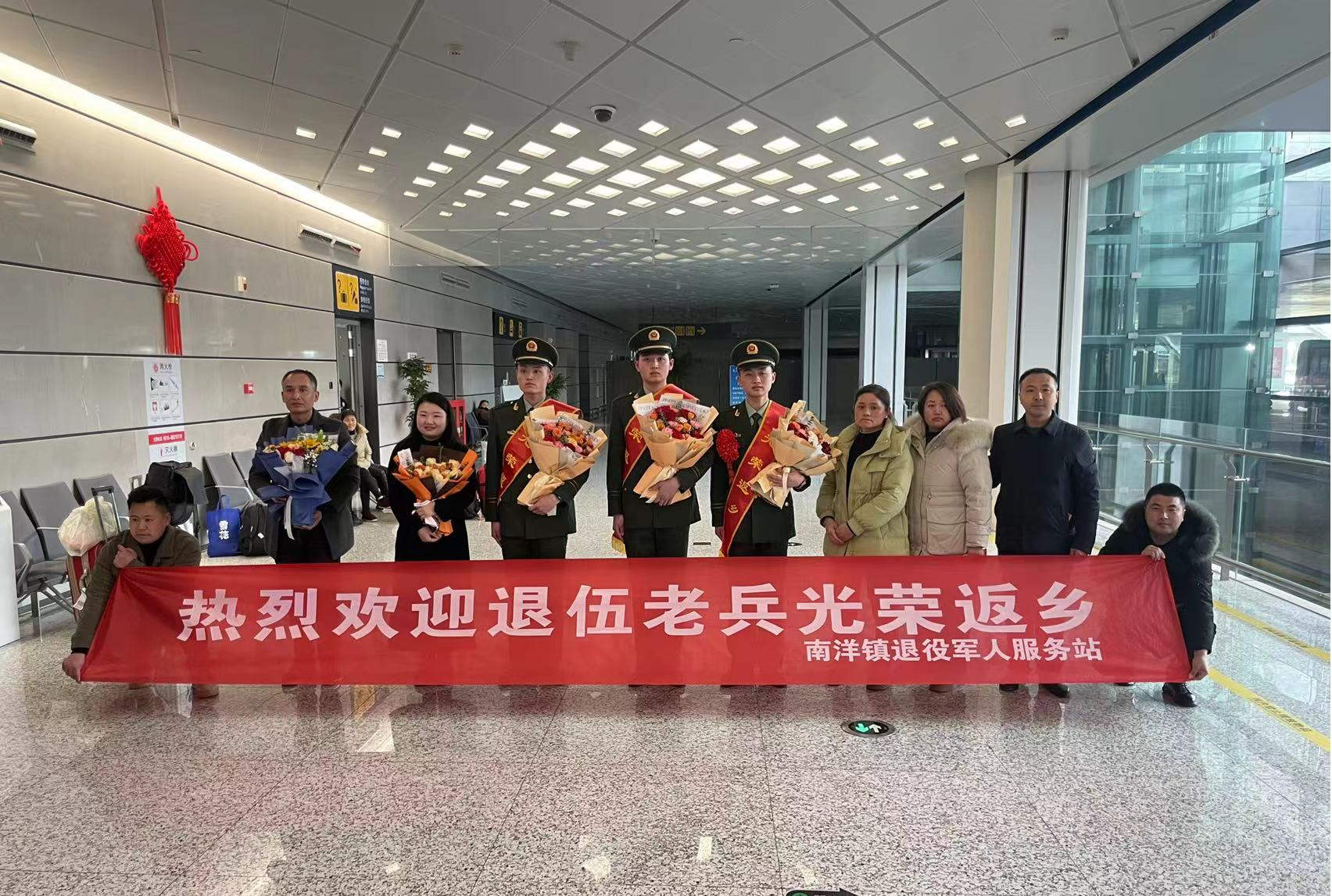 该区毓龙街道、先锋街道、宝瓶湖街道、文峰街道、东亭湖街道、新兴镇、南洋镇退服站工作人员在盐城高铁站、南洋机场出口,带着准备好的横幅和鲜花,热烈欢迎返乡退役军人的归来,对他们为国家贡献青春、为家乡争得荣光表示感谢。