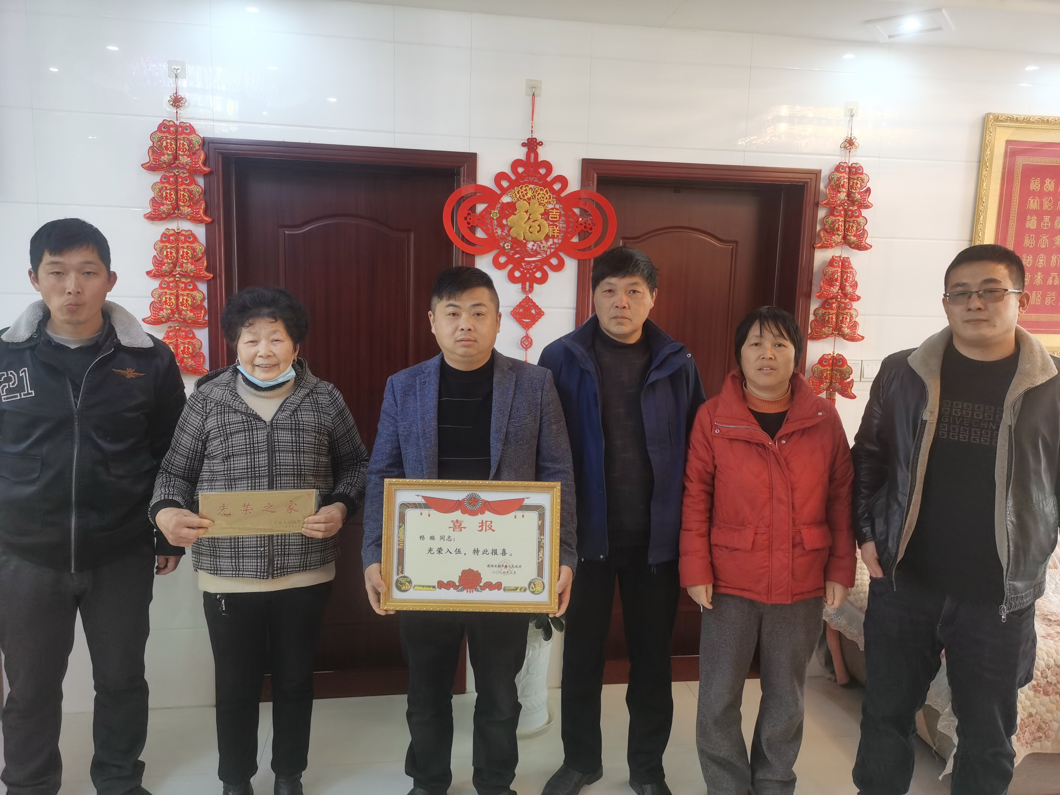 近日,滨海县东坎街道组织退役军人服务站工作人员为新入伍战士的家庭悬挂光荣牌,持续造浓“一人参军,全家光荣”的社会氛围。